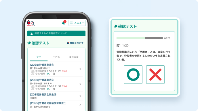 テキストと動画で内容をインプットしたらeラーニングシステム「ManaBun マナブン」でチェックテスト、確認テストを行い知識を定着して行きます。