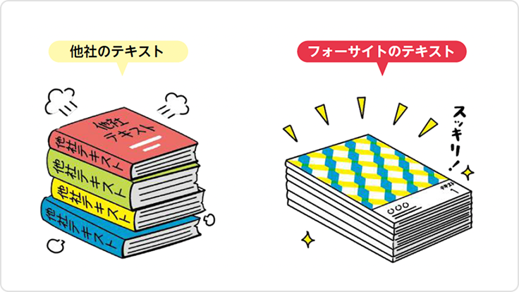 フォーサイトの高い合格率を支えるのが、「合格点主義」のテキストです。何でも載っているテキスト(満点主義)は「安心感」を与えてくれますが、実際にすべてを理解して覚えるのは大変です。合格するために必要なことは満点を取ることではなく、合格ラインをクリアすることなのです。