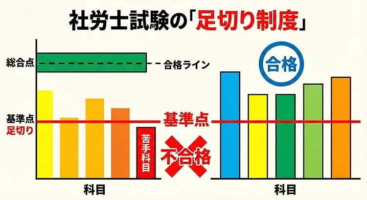 厚生労働省の発表によると、社労士試験の合格率は例年6〜7%台で推移しています。しかし、この数字以上に受験生を苦しめるのが「基準点制度(足切り)」の存在です。社労士試験では、選択式・択一式それぞれで各科目ごとに基準点が設定されており、たとえ総合点で合格ラインを超えていても、1科目でも基準点を下回ると不合格になってしまいます。