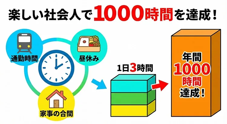社労士試験の合格に必要な学習時間は、一般的に800〜1,000時間と言われています。これを1年間で達成しようとすると、毎日約3時間の学習が必要になります。残業のある会社員にとって、机に向かう時間だけでこれを確保するのは現実的ではありません。