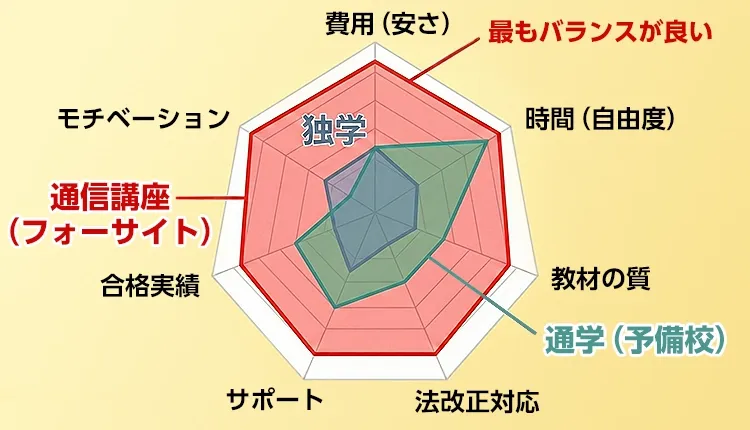 | 比較項目 | 独学 | 通学(予備校) | 通信講座(フォーサイト) |